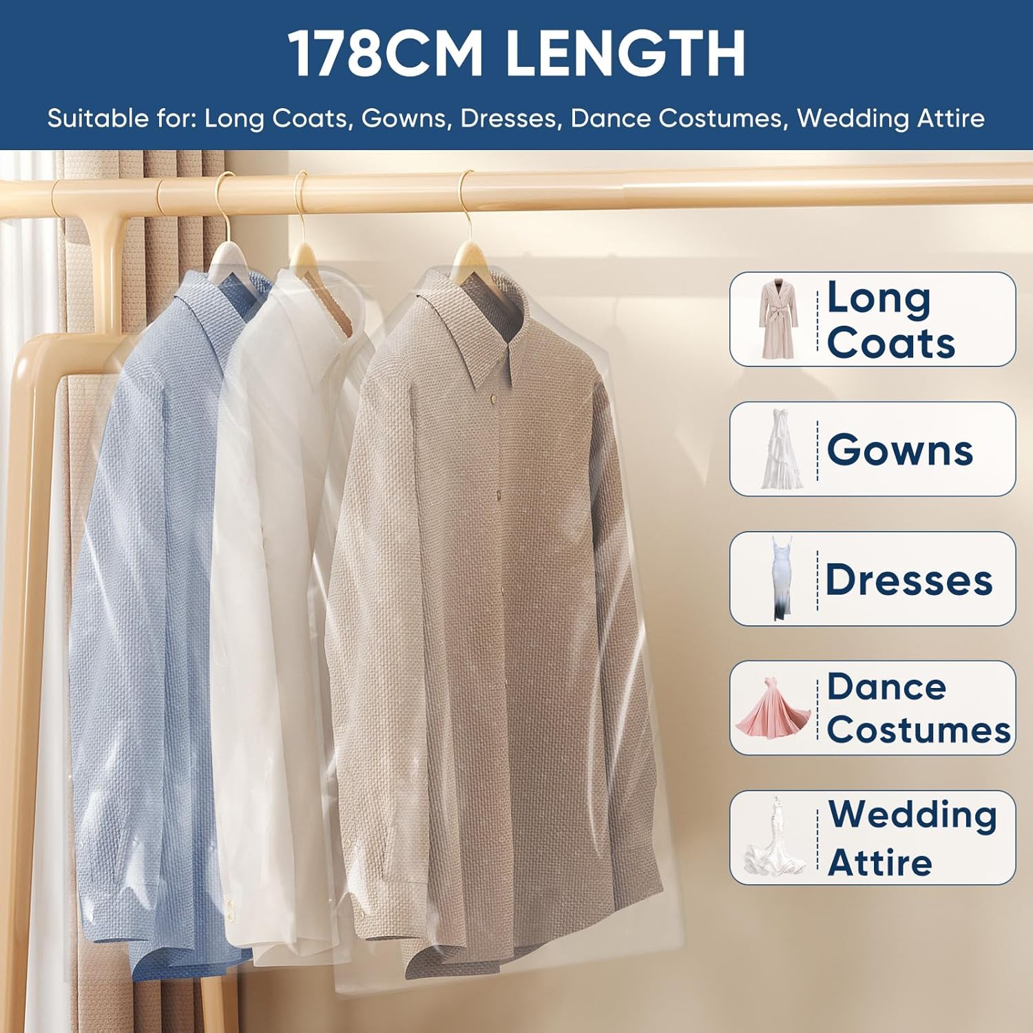 - Use Case: Closet storage, dry cleaning, travel, formalwear protection