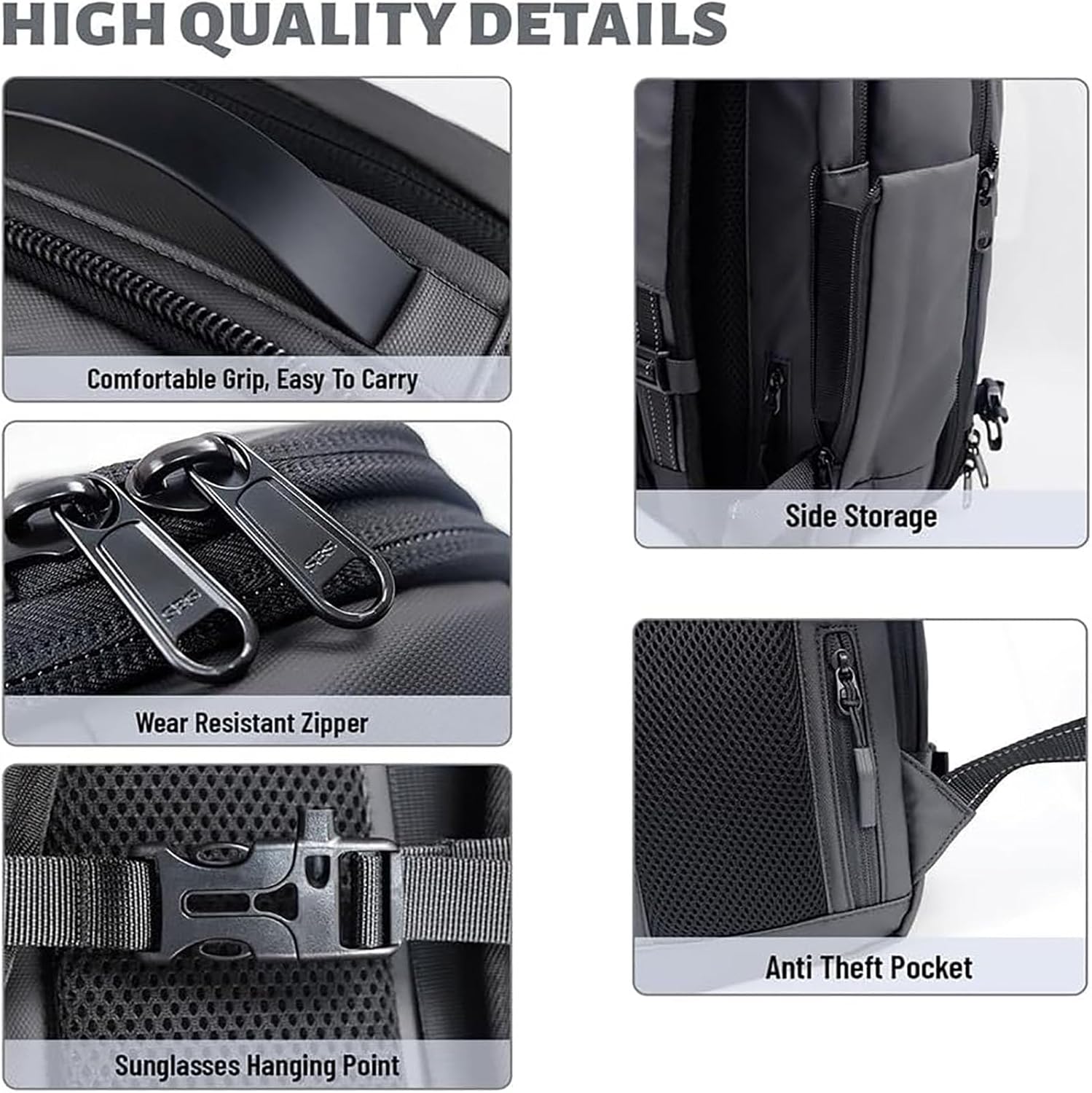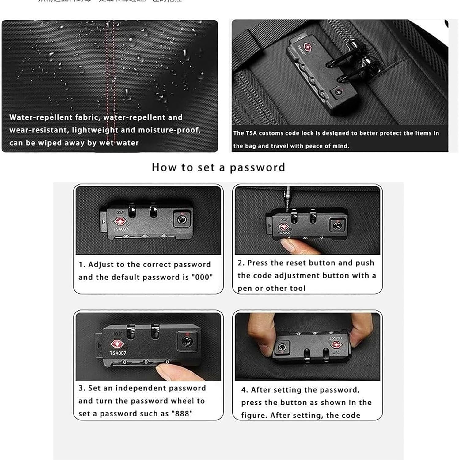 - Anti-theft password lock and hidden zippered back pocket